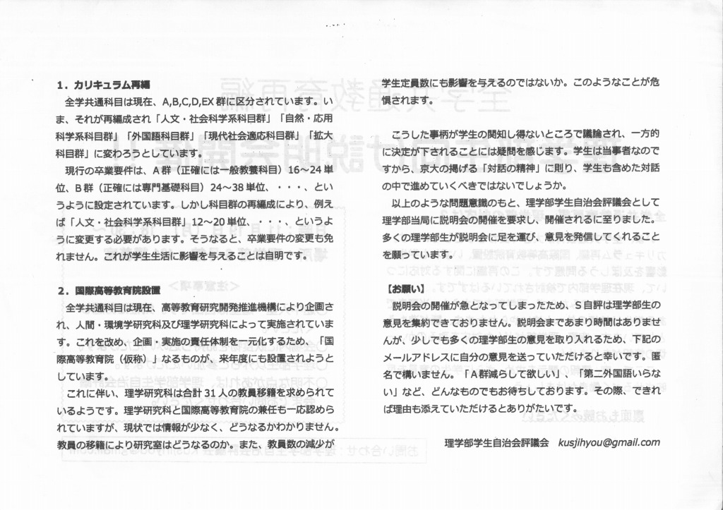 夕方からは理学部自治会評議会の要求に基づき、理学研究科の教官からの説明会がありました。