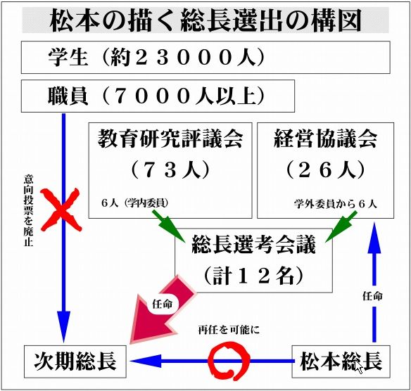 今回の松本による策動が実際に行われれば、事実上の独裁が可能になる。なぜなら国立大学法人法(04年)によって総長は「総長選考会議」の多数決で決定されることとなっており、その半数を占める学外委員は「経営協議会」から選出され、その経営協議会委員の任命権は他でもない松本自身にあるからだ(※図参照)。自分を支持しない者をわざわざ経営協議会の委員にするとは考えにくいため、松本は学内委員6人のうち1人の賛成だけでも取り付ければ事実上総長になることが可能なのである。