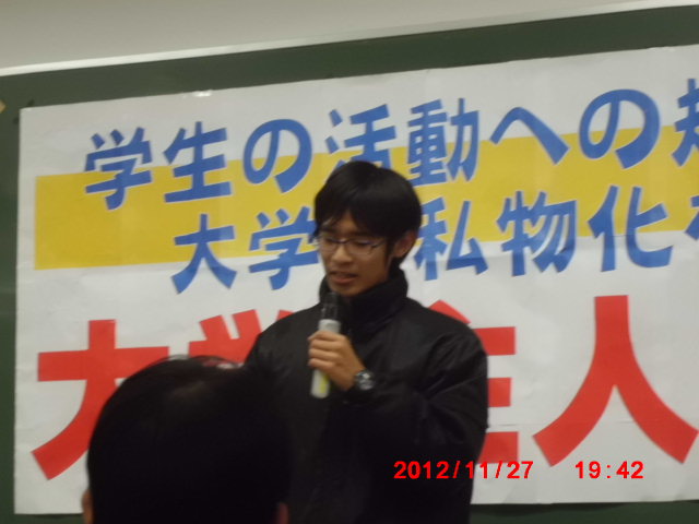 学生戦線においても、学費の増加、奨学金の削減、他方におけるローンの拡大、内定率低下、自殺、何より、学生自治破壊の結果としての、御用学者の跋扈。これは、国立大学法人化を絶対に曖昧にしない、法人化に手を貸した日本共産党スターリン主義を曖昧にしない、何より、学生が大学で自治会をつくって団結することが大事です。
