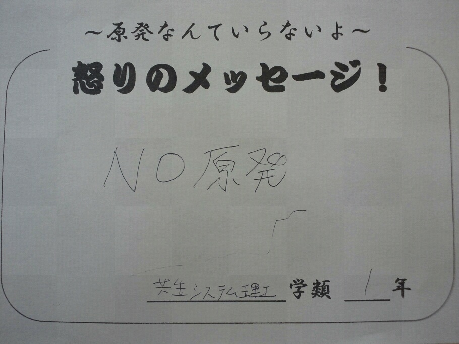 福島大学の学生です。今、福島大学には大学側からは発表されていない放射線量が高いホットスポットがあります。しかし、大学側はそれに対しては何の発表も行わず、除染についても「準備はしている」というような曖昧なことだけしか言わず、今まで何もせずに学生の被曝を見て見ぬふりしてきました。ですが、今の福大生の現状はそういった環境の中で家族や自分、周りの人たちへの健康への影響、危険を感じながらも、考えると怖くなる、不安になるというようなことがあり、放射線の影響をなるべく考えないようにごく普通の生活に戻ってしまいつつあると思います。また、そのような大学の対応、大学側から学生に対してまったく説明がないJAEA(原子力開発機構)との提携などに対して声を上げようにも、自分ひとりだけでは何もできないのではないか、大学や周りからの目が変わるのではないか、などといった壁があり、なかなか行動に踏み込めないというような葛藤があると思います。しかし私は最近、全学連の方と交流し学習会に参加させていただいたことで、視野が広がり日本の政府の政策や社会、世界経済、大学が抱える様々な問題を知ることができました。