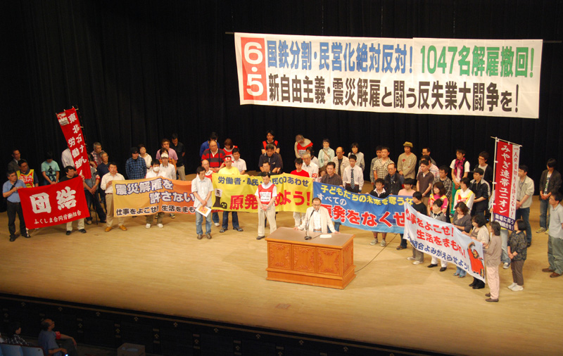 被災地・福島と宮城から参加した労働者・保護者が登壇。「生きていくために団結しなければならない」と訴えました。