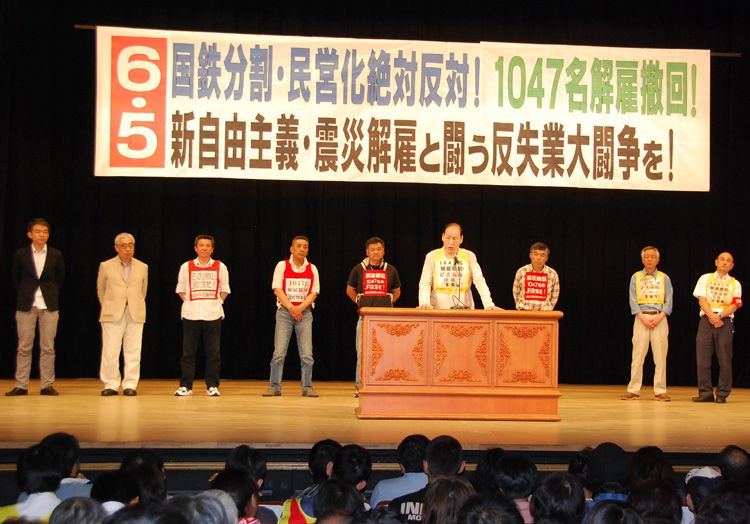 国鉄分割民営化反対・解雇撤回で闘う争議団が発言。「労働組合が解雇撤回を闘う、そんな当たり前の労働運動をよみがえらせる。国労本部の闘争団除名を絶対に許さない」と熱烈にアピール。