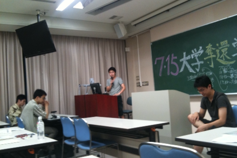 ギリシャの話では、「国が破綻しようが学問は不滅であると、大学は不滅であると確信できた」と述べ、自身の研究室や院生・ポスドクの現実を述べたうえで、自治講座の大きな目標として、単位制の撤廃を掲げました!会場、拍手で応えます。