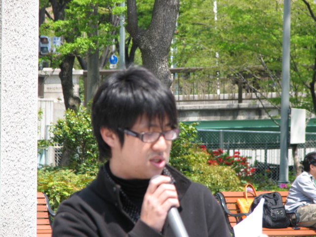 今、世界中で、そしてここ日本でも、反原発の運動が高揚しています。3・11の事故を受けて、ドイツでは25万人のデモ。国内でも1万人以上の規模で繰り返しデモが行われ、先日9月19日には東京明治公園で6万人の集会・デモが打ち抜かれました。歴史は確実に動いています。そして、本当に原発を止めていくためには、この結集を力に変えていかなければいけません。それには集まるだけでなく、その人たちが現場で権力を取っていくということが重要です。私たちは、京大生として、京大の勝手な振る舞いは許さない、人民にさらに負担を押し付け、金儲けの手伝いをするなんてことさせないという決意で、今日の集会を闘いぬいていきたいと思います。