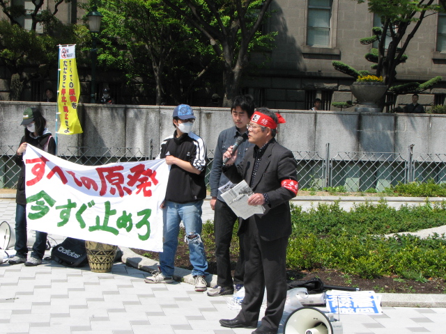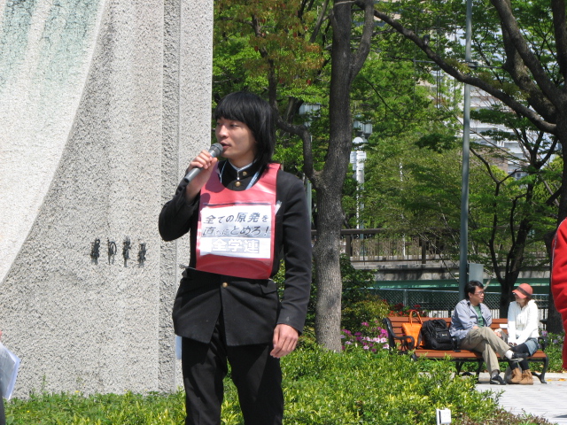 全学連の学生が基調を提起。「すべての原発を直ちに停止し、廃炉にしよう!」「労働組合、学生自治会をよみがえらせ、原発事故をもたらした新自由主義を打ち破ろう!」と、反原発闘争の核心問題を提起した。「原発事故の核心的原因は新自由主義であり、その出発点となった87年の国鉄分割・民営化です」「原発で働く東電の社員はおよそ1万人であるのに対して、下請け労働者は7万5千人。組合に入っていない非正規労働者に危険な作業を押し付け、資本とは全く闘わない、こういう形で労働組