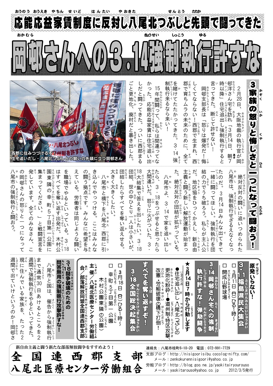 全国の労働者、農民、闘う仲間 のみなさん。3・11東日本大震災と原発事故から一周年を前に、反対同盟は被災地の怒りと闘いに連帯する決意を新たにします。原発再稼働と沖縄・辺野古新 基地建設、TPP(環太平洋経済連携協定)強行の動きに対して、反対同盟は「国策」=空港建設絶対反対をつらぬいた46年の闘いの原点に立ち、農地死守の 決戦をもって闘う決意です。