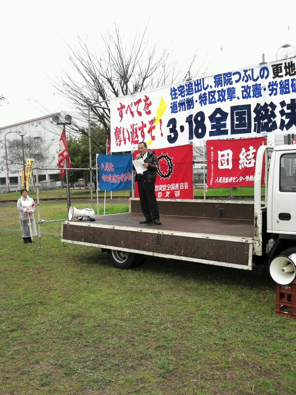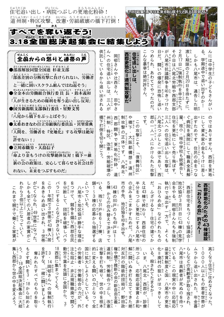 3月18日(日)、八尾市で開催される全国総決起集会は新自由主義と対決する団結を打ち固める集会です。全ての労働者・学生はここに集まろう。