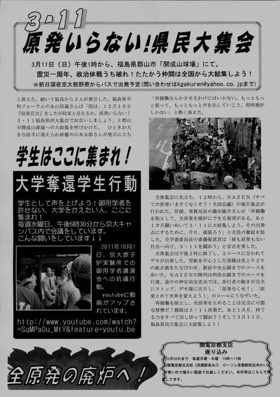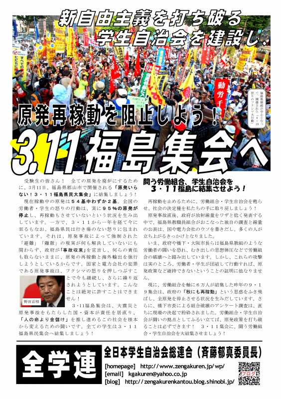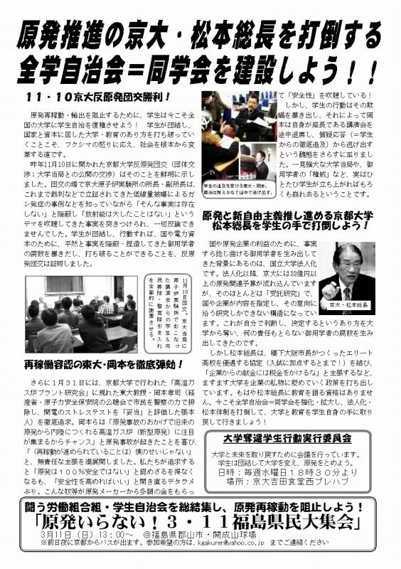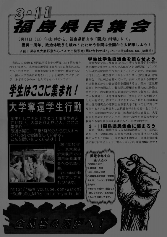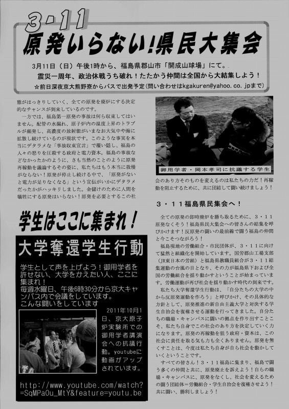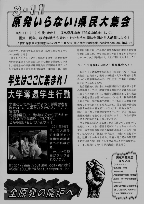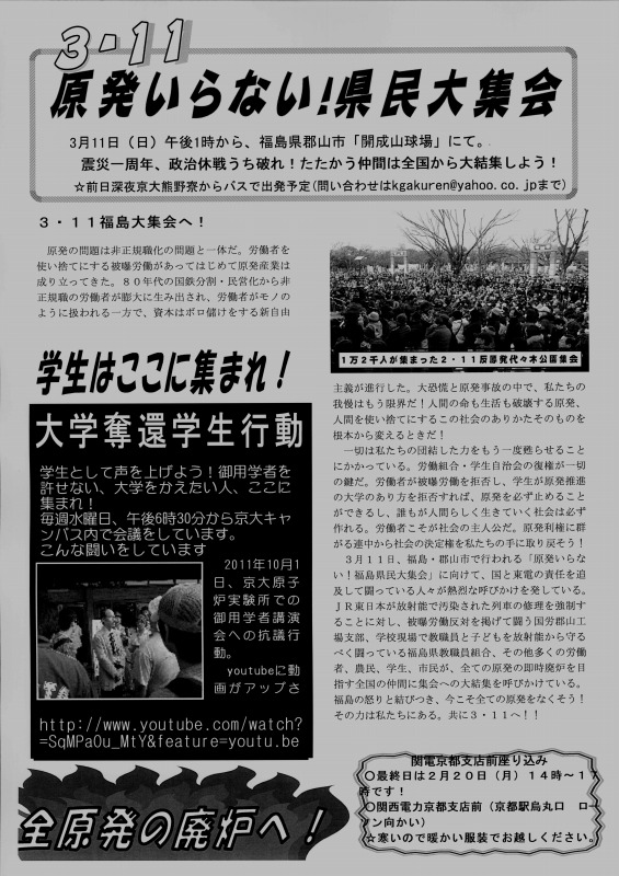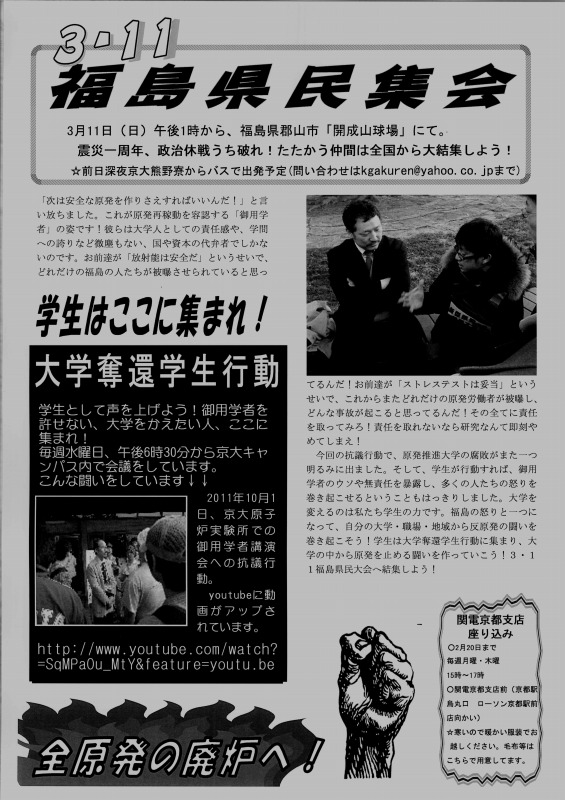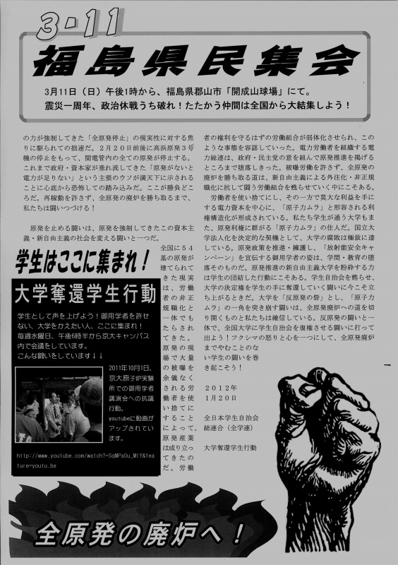 この腐敗しきった社会を変える展望は、学生自治会にあります。既に関電管内で稼動する原発はなくなりました!「電力足りない」、「放射能は無害」といったデマを粉砕してきた、我々の闘いが社会を揺り動かしています!これからも、学生の力で社会を変える運動を展開していきます。その上で、3.11郡山集会、3.18西郡集会への結集を心から呼びかけます!
