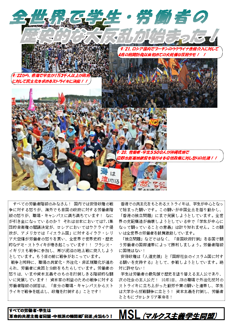 すべての労働者階級のみなさん! 国内では安倍政権の戦争に対する怒りが、海外でも自国の政府に対する労働者階級の怒りが、職場・キャンパスに満ち満ちています! なにが引き金になっているのか? それは日本においては7.1集団的自衛権の閣議決定が、ロシアにおいてはウクライナ侵攻が、アメリカでは「イスラム国」に対するイラク・シリア大空爆が労働者の怒りを買い、全世界で世界史的・歴史的なデモ・ストライキが巻き起こっています!! フランス・イギリスも戦争に参加し、再び泥沼の地上戦に突入しようとしています。もう目の前に戦争がおこっています。