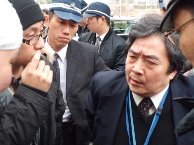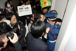 本来、一般公開であるはずの意見聴取会は突然「非公開」となった。山本太郎さんを先頭に公開を求める抗議が続いた。意見聴取会は会場から逃げ出した委員らの手によって4時間遅れで、当初予定されていたのとは別の部屋で開催された。2人の委員が「非公開」に抗議して欠席した。