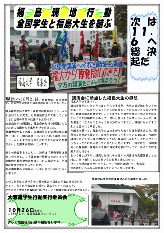 一昨日は、10・21福島行動に決起してきました。京大だけではなく福島大の学生ともつながってきましたよ!