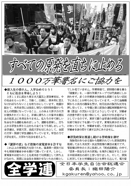 署名運動を通して学生の可能性を取り戻し、学生自身の団結組織である学生自治会を甦らせよう! あらためて、4月22日の「反原発一日行動」への参加を訴えます!