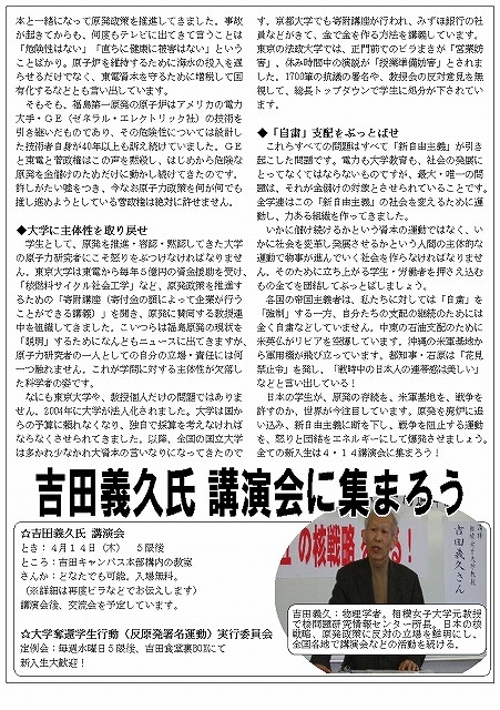 4:この闘いの一環として、私たちは大学の腐敗せる現状をなんとしても打ち破りたいと考えています。新自由主義は、労働組合の破壊と共に、教育や医療を全面的に民営化し、営利の対象とするために展開されてきました。東大では東京電力が毎年5億円以上を注ぎ込んで原発推進の講座を買い取り、「原発は安全でクリーン」という許しがたいデマを振りまくことに大学が加担してきました。その一方で、原発に反対する学者、研究者はとことん冷遇され、その意見は黙殺され続けてきたのです。このような大学の腐敗と転落こそ、今回の原発事故や、津波の被害拡大をもたらした元凶の一つです。労働者、農民、漁民、あらゆる人々の怒りの決起と一体で、学生も立ち上がり、大学を取り戻すことが求められています。