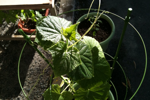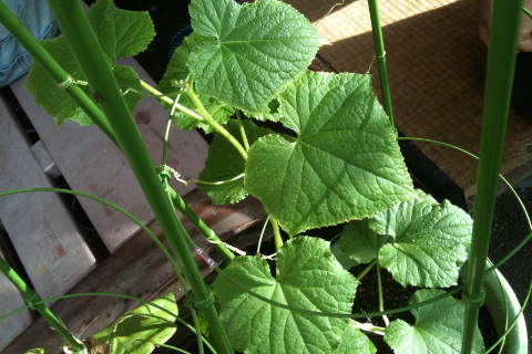 今いちばん勢いがあるのはやっぱりゴーヤとキュウリですね。こちらはキュウリ。