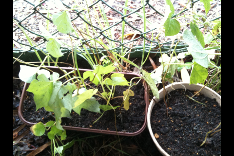つぼみもたくさんついて開花も間近と思われていた矢先、朝顔と夕顔のプランターが何者かによってひっくり返されてしまいました・・・