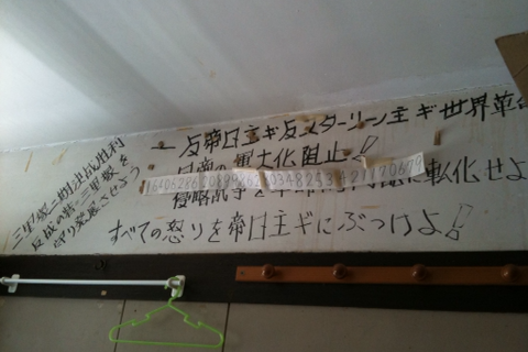 学生自治寮にはやっぱり、貼りビラと落書きですよね。おもしろい落書きはいたるところで発見できました。